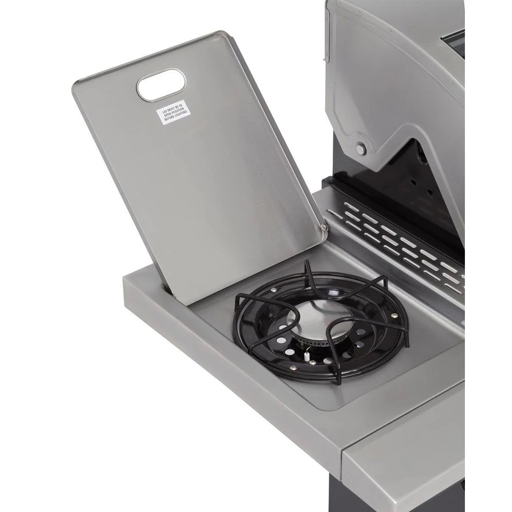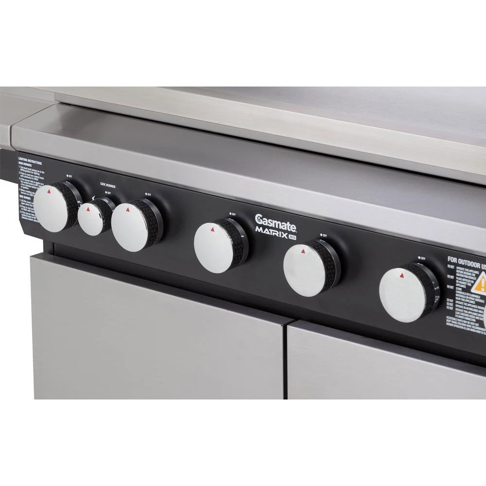 Extend your cooking area with the flush mounted high output side-burner and lift up the drop-down side shelf for added prep space. The Matrix comes with a cover included, so you can be assured Gasmate has you covered!